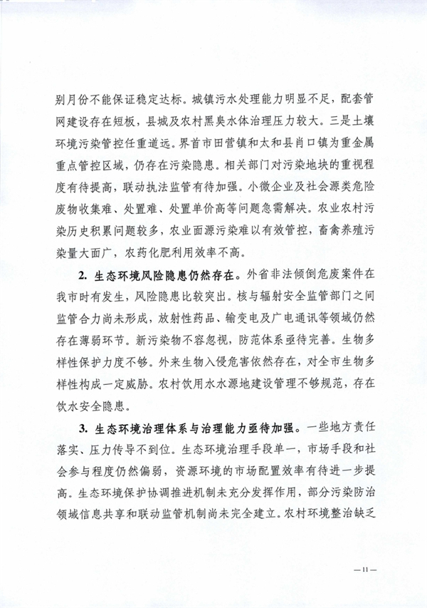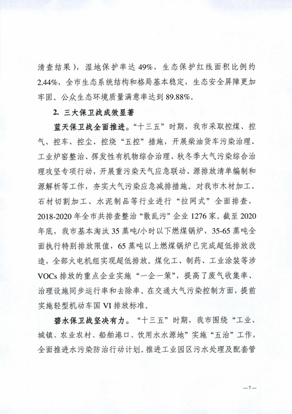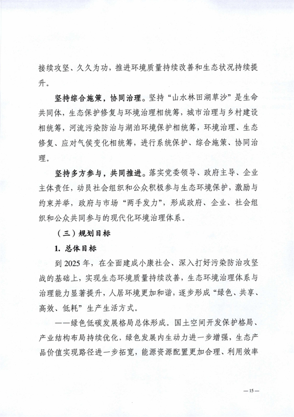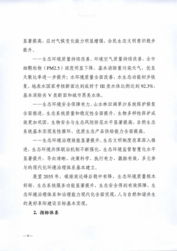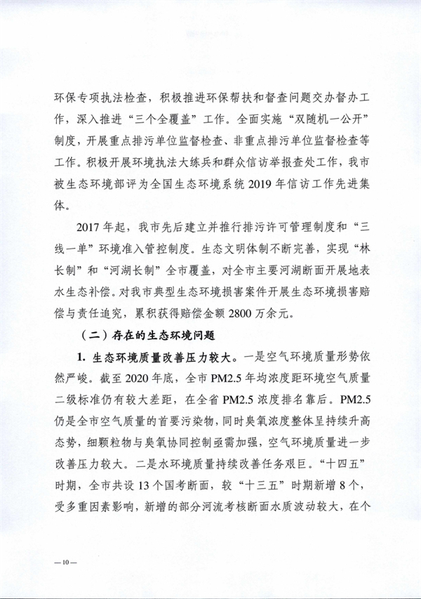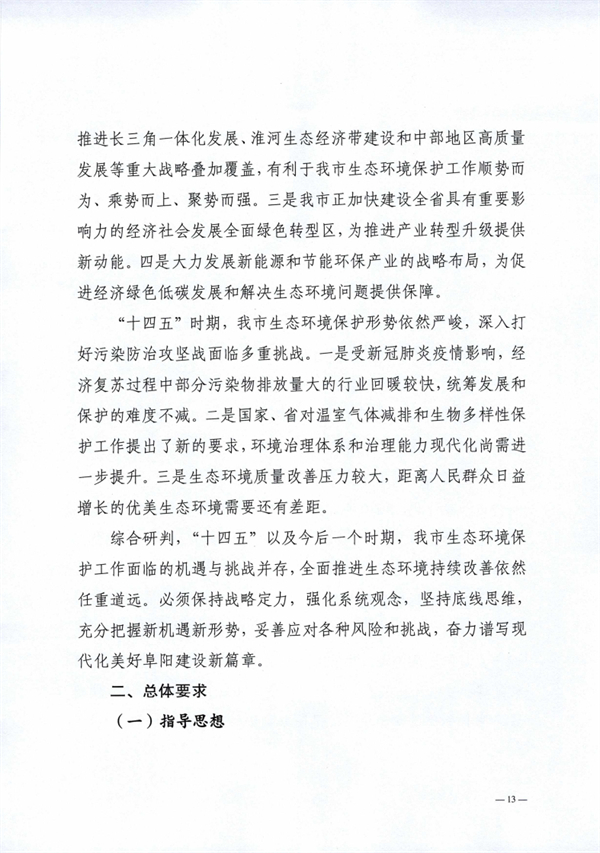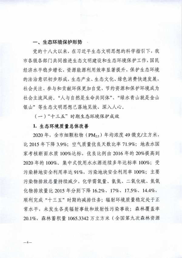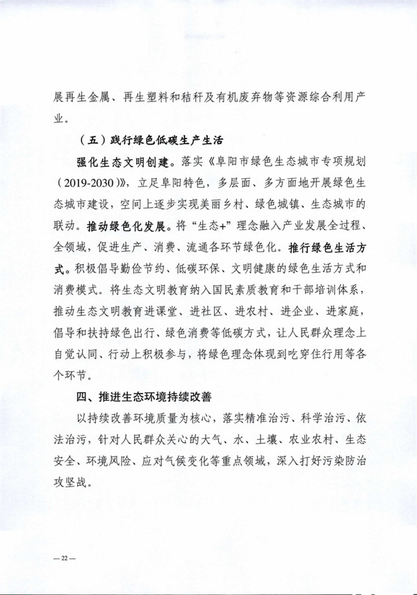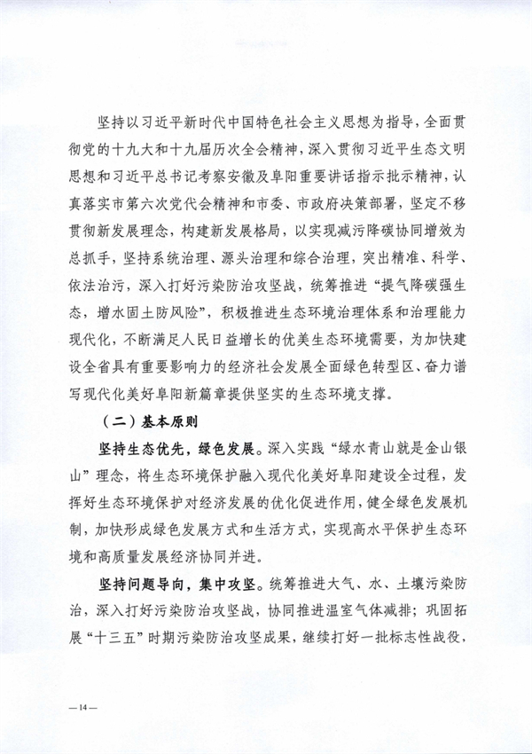 阜陽市生態(tài)環(huán)境局 阜陽市發(fā)展和改革委員會印發(fā)《阜陽市“十四五”生態(tài)環(huán)境保護規(guī)劃》,以實現(xiàn)減污降碳協(xié)同增效為總抓手,堅持系統(tǒng)治理、源頭治理和綜合治理,突出精準、科學、依法治污,深入打好污染防治攻堅戰(zhàn),統(tǒng)籌推進“提氣降碳強生態(tài),增水固土防風險”,積極推進生態(tài)環(huán)境治理體系和治理能力現(xiàn)代化,不斷滿足人民日益增長的優(yōu)美生態(tài)環(huán)境需要,為加快建設全省具有重要影響力的經(jīng)濟社會發(fā)展全面綠色轉(zhuǎn)型區(qū)、奮力譜寫現(xiàn)代化美好阜陽新篇章提供堅實的生態(tài)環(huán)境支撐。