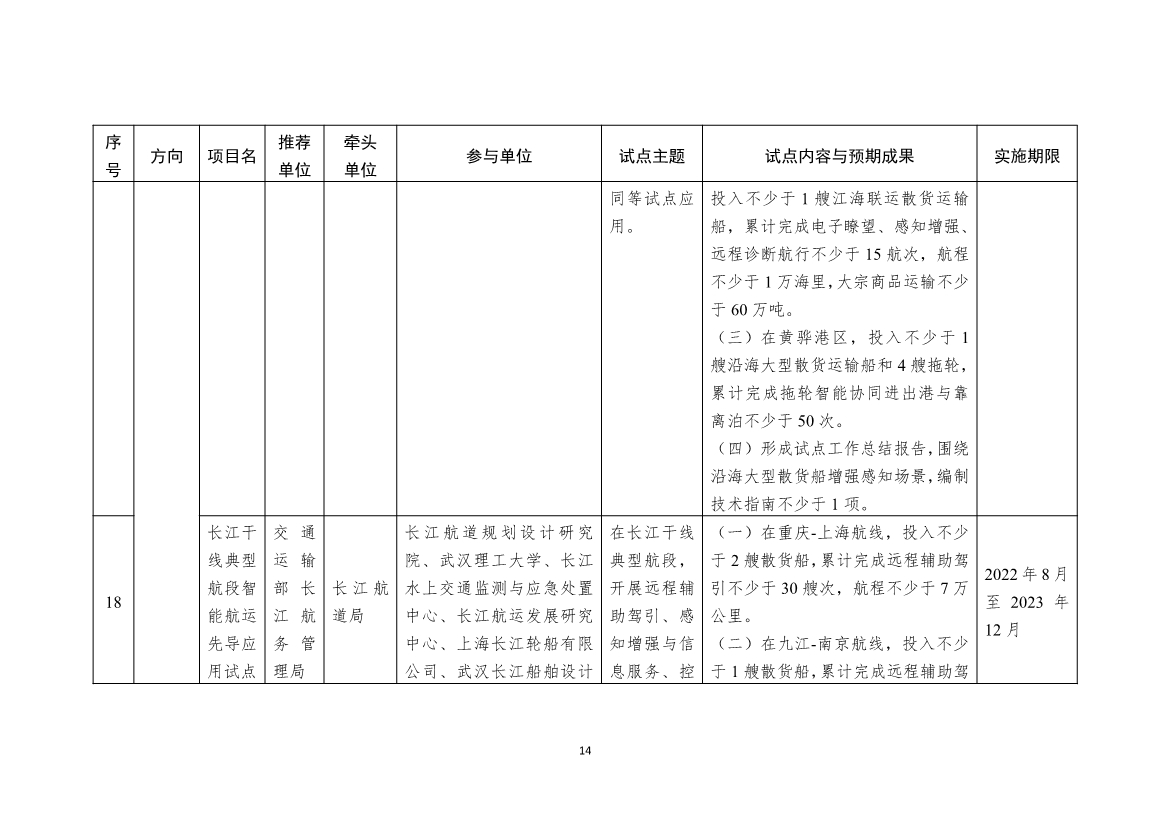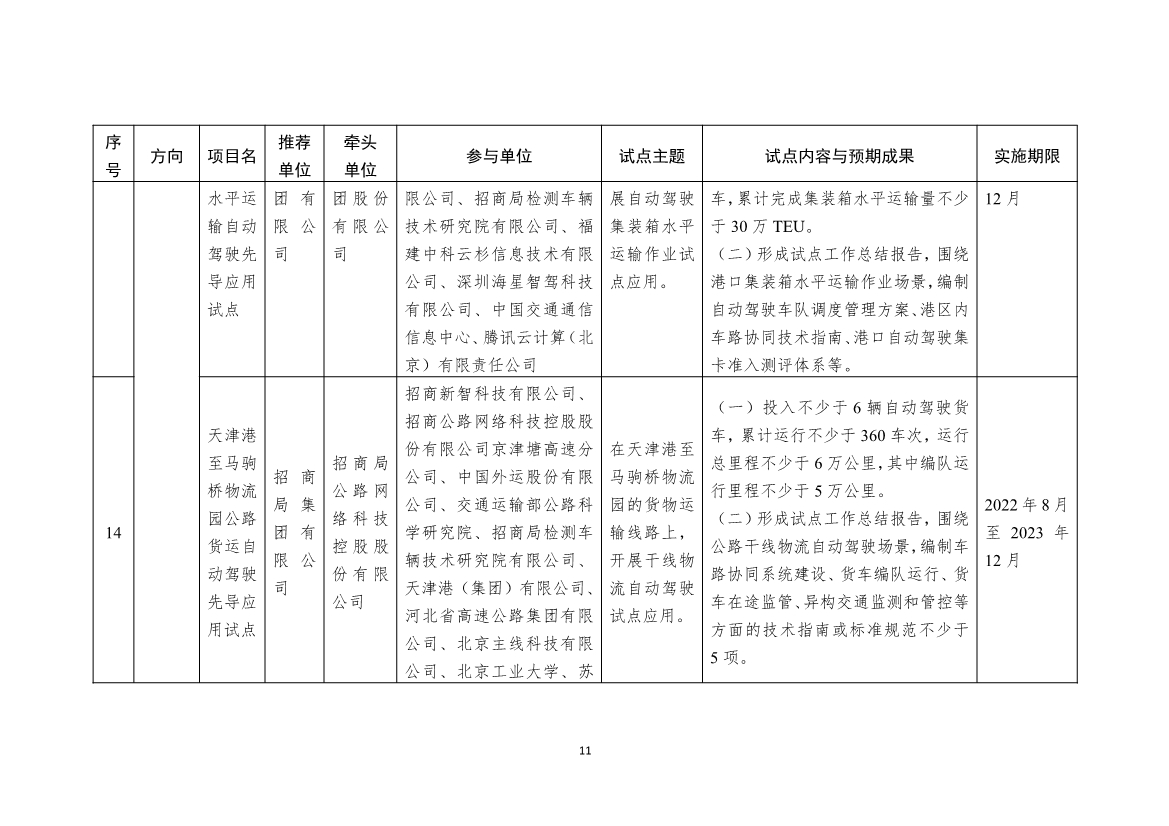 為落實《“十四五”交通領域科技創(chuàng)新規(guī)劃》相關任務,經(jīng)自主申報、相關單位推薦和專家評審,交通運輸部同意將“北京城市出行服務與物流自動駕駛先導應用試點”等18個項目作為第一批智能交通先導應用試點項目,現(xiàn)予以公布(名單見附件)?,F(xiàn)將有關事宜通知如下:
