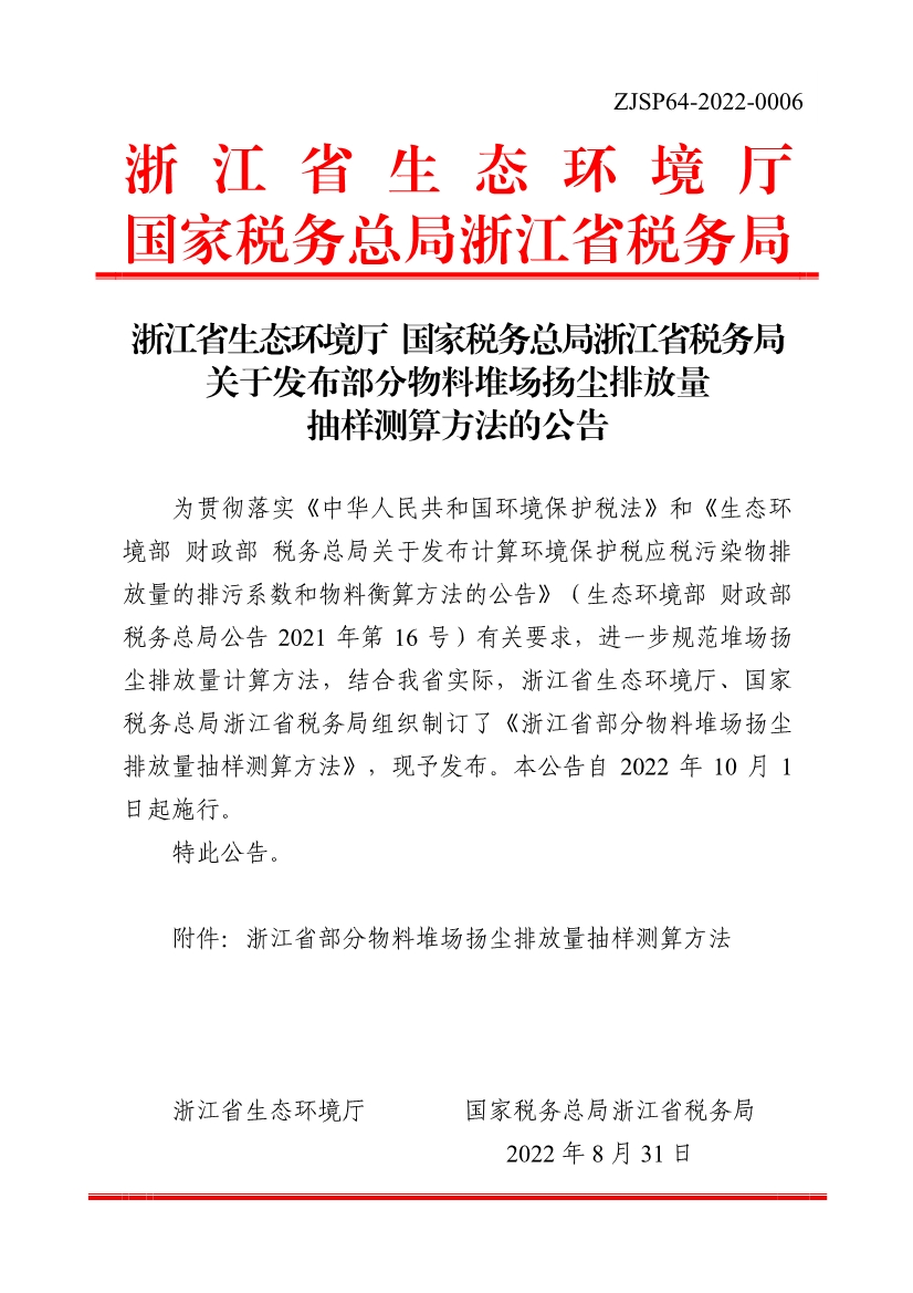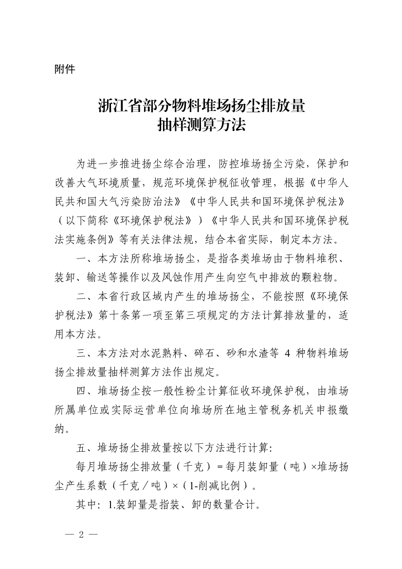 為進(jìn)一步推進(jìn)揚(yáng)塵綜合治理,防控堆場揚(yáng)塵污染,保護(hù)和改善大氣環(huán)境質(zhì)量,規(guī)范環(huán)境保護(hù)稅征收管理,根據(jù)《中華人民共和國大氣污染防治法》《中華人民共和國環(huán)境保護(hù)稅法》(以下簡稱《環(huán)境保護(hù)稅法》)《中華人民共和國環(huán)境保護(hù)稅法實(shí)施條例》等有關(guān)法律法規(guī),浙江制定《浙江省部分物料堆場揚(yáng)塵排放量抽樣測算方法》。詳情如下: