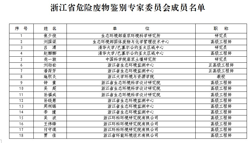 浙江省危險廢物鑒別專家委員會成員名單(第一批)