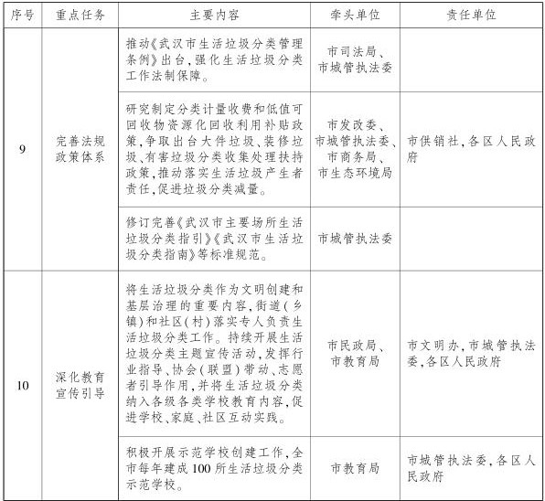 (九)完善法規(guī)政策體系。推動(dòng)《武漢市生活垃圾分類管理?xiàng)l例》出臺(tái),強(qiáng)化生活垃圾分類工作法制保障。研究制定分類計(jì)量收費(fèi)和低值可回收物資源化回收利用補(bǔ)貼政策,爭(zhēng)取出臺(tái)大件垃圾、裝修垃圾、有害垃圾分類收集處理扶持政策,推動(dòng)落實(shí)生活垃圾產(chǎn)生者責(zé)任,促進(jìn)垃圾分類減量。修訂完善《武漢市主要場(chǎng)所生活垃圾分類指引》《武漢市生活垃圾分類指南》等標(biāo)準(zhǔn)規(guī)范。