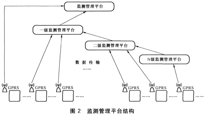 監(jiān)測(cè)管理平臺(tái)結(jié)構(gòu)參見(jiàn)圖2。應(yīng)采用多層結(jié)構(gòu)進(jìn)行管理,上級(jí)管理平臺(tái)既能管理下一級(jí)管理平臺(tái),也能實(shí)現(xiàn)對(duì)最末端監(jiān)測(cè)終端進(jìn)行遠(yuǎn)程監(jiān)視等管理功能。