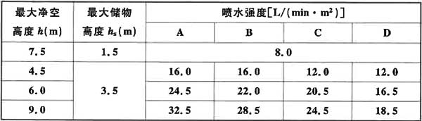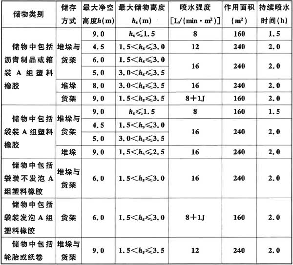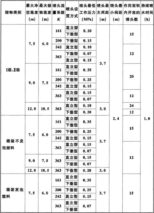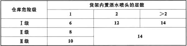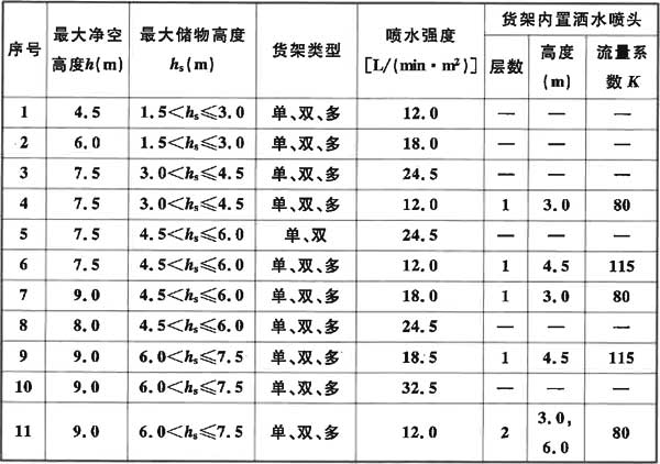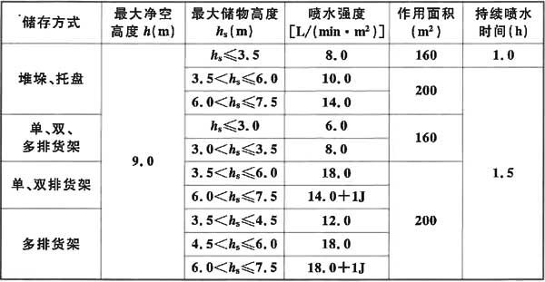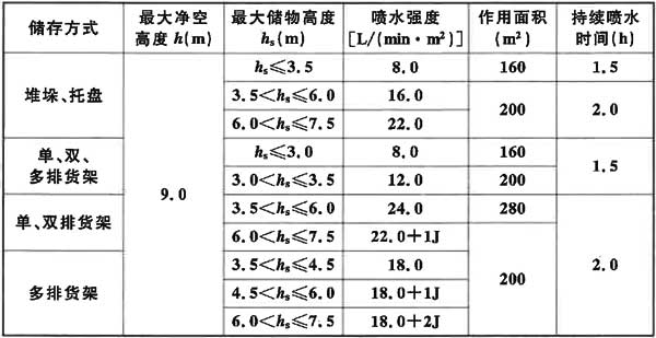 注:1 貨架儲物高度大于7.5m時,應(yīng)設(shè)置貨架內(nèi)置灑水噴頭。頂板下灑水噴頭的噴水強度不應(yīng)低于18L/(min·m2),作用面積不應(yīng)小于200m2,持續(xù)噴水時間不應(yīng)小于2h。