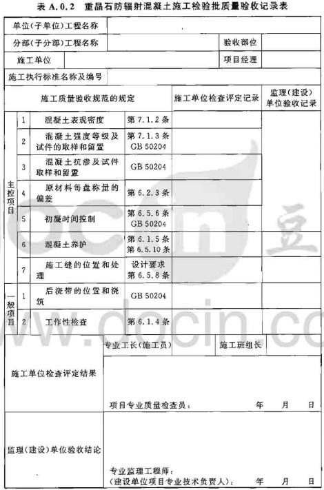 表A.0.2重晶石防輻射混凝土施工檢驗(yàn)批質(zhì)量驗(yàn)收記錄表