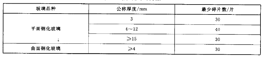 取4塊玻璃試樣進(jìn)行試驗(yàn),每塊試樣在任何50 mm×50 mm區(qū)域內(nèi)的最少碎片數(shù)必須滿足表7的要求。且允許有少量長條形碎片,其長度不超過75 mm。