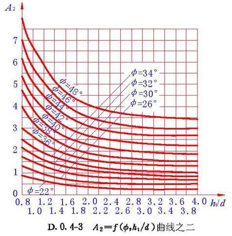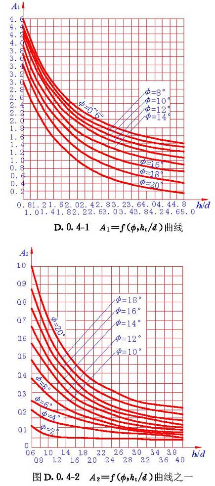 A1、A2——與φ、ht/d有關(guān)的無因次系數(shù),按圖D.0.4-1、D.0.4-2、D.0.4-3確定;這里的φ為土的計算內(nèi)摩擦角,對粘性土和砂類土按表D.0.4-1、D.0.4-2、D.0.4-3采用;