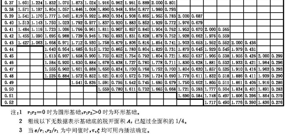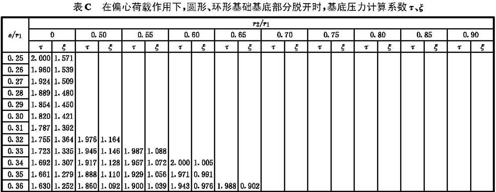 附錄C 在偏心荷載作用下,圓形、環(huán)形基礎(chǔ)基底部分脫開時,基底壓力計算系數(shù)τ、ξ