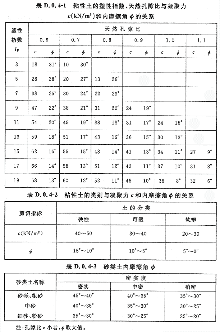 式中 c——土體飽和狀態(tài)下的凝聚力(N/m2);對粘性土,當(dāng)具有塑性指數(shù)Ip和天然孔隙比e時可按表D.0.4-1確定;當(dāng)粗略估計土體抗拔時,可根據(jù)土的密實度按表D.0.4-2確定;