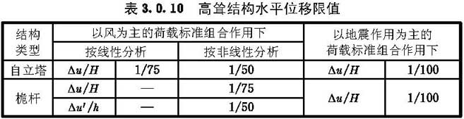 6 高聳結(jié)構(gòu)在以風(fēng)為主的荷載標(biāo)準(zhǔn)組合及以地震作用為主的荷載標(biāo)準(zhǔn)組合下的水平位移,不得大于表3.0.10的規(guī)定。