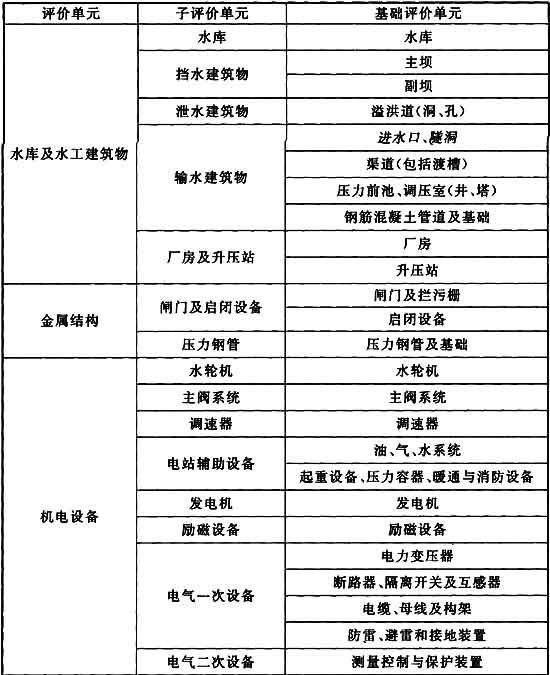 1 按電站主要構(gòu)成和安全影響要素應(yīng)劃分為水庫及水工建筑物、金屬結(jié)構(gòu)、機(jī)電設(shè)備、安全運(yùn)行管理4個(gè)評價(jià)單元。