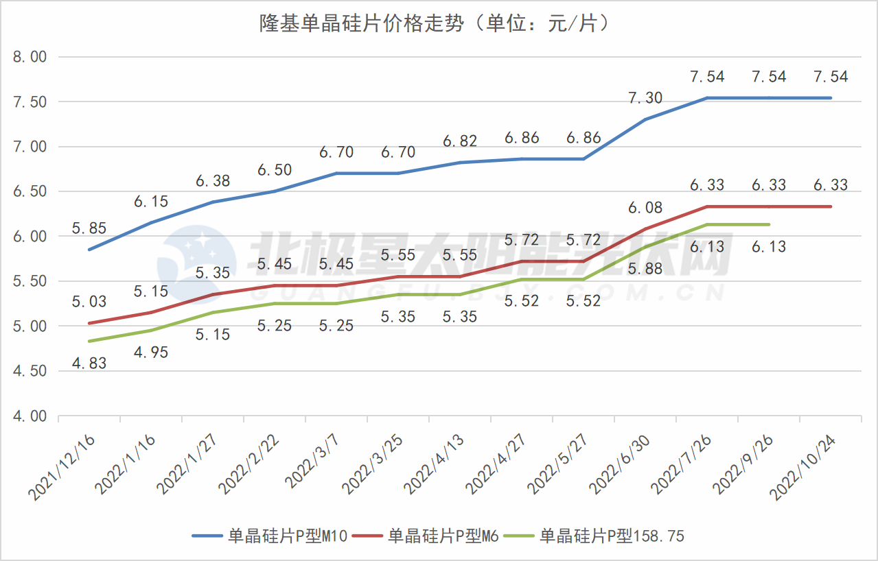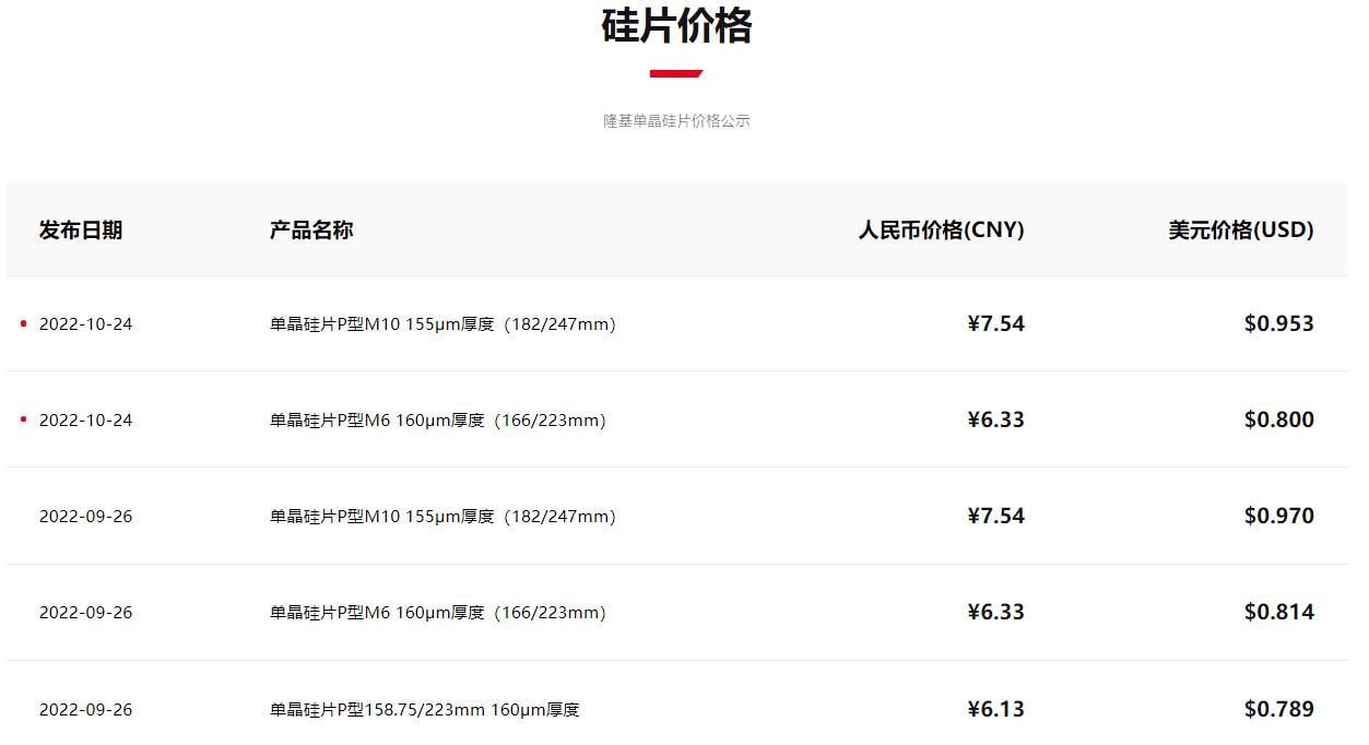 10月24日,隆基發(fā)布最新單晶硅片價格公示,與上次(9月26日)報價相比,M10、M6硅片價格未變,分別為7.54元/片、6.33元/片;G1單晶硅片報價取消,該規(guī)格上次報價為6.13元/片。隆基單晶硅片最新報價:M10、M6維穩(wěn),G1報價取消