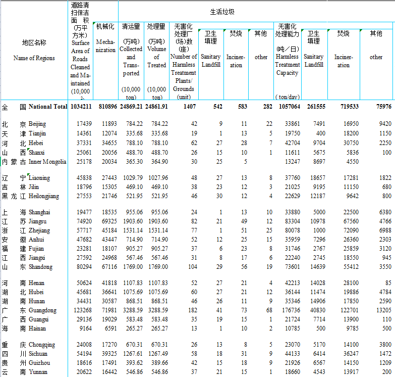 獲悉,住建部發(fā)布《2021年城鄉(xiāng)建設統(tǒng)計年鑒》,2021年全國道路清掃保潔面積為1034211萬平方米,無害化處理廠達1407座,其中衛(wèi)生填埋場542座,垃圾焚燒廠583座,無害化處理能力達1057064噸/日,詳情如下: