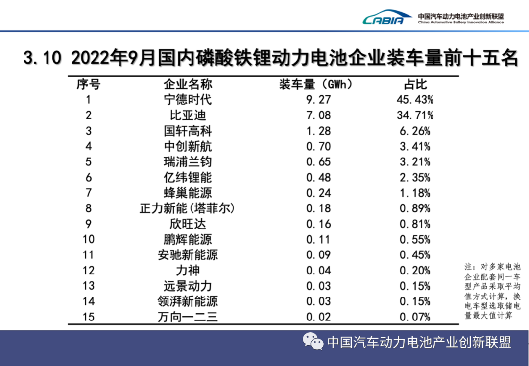9月,我國(guó)動(dòng)力電池裝車(chē)量31.6GWh,同比增長(zhǎng)101.6%,環(huán)比增長(zhǎng)14.0%。其中三元電池裝車(chē)量11.2GWh,占總裝車(chē)量35.4%,同比增長(zhǎng)82.6%,環(huán)比增長(zhǎng)6.5%;磷酸鐵鋰電池裝車(chē)量20.4GWh,占總裝車(chē)量64.5%,同比增長(zhǎng)113.8%,環(huán)比增長(zhǎng)18.5%。1-9月,我國(guó)動(dòng)力電池累計(jì)裝車(chē)量193.7GWh, 累計(jì)同比增長(zhǎng)110.5%。其中三元電池累計(jì)裝車(chē)量77.2GWh,占總裝車(chē)量39.8%,累計(jì)同比增長(zhǎng)63.9%;磷酸鐵鋰電池累計(jì)裝車(chē)量116.3GWh,占總裝車(chē)量60.1%,累計(jì)同比增長(zhǎng)159.8%。9月,我國(guó)新能源汽車(chē)市場(chǎng)共計(jì)36家動(dòng)力電池企業(yè)實(shí)現(xiàn)裝車(chē)配套,較去年同期減少3家。排名前3家、前5家、前10家動(dòng)力電池企業(yè)動(dòng)力電池裝車(chē)量分別為24.2GWh、26.5GWh和29.9GWh,占總裝車(chē)量比分別為76.4%、83.7%和94.6%。1-9月,我國(guó)新能源汽車(chē)市場(chǎng)共計(jì)48家動(dòng)力電池企業(yè)實(shí)現(xiàn)裝車(chē)配套,較去年同期減少6家,排名前3家、前5家、前10家動(dòng)力電池企業(yè)動(dòng)力電池裝車(chē)量分別為148.4GWh、162.6GWh和182.9GWh,占總裝車(chē)量比分別為76.6%、83.9%和94.4%。出口方面:9月,我國(guó)動(dòng)力電池出口量共計(jì)6.8GWh。其中三元電池出口量4.6GWh,磷酸鐵鋰電池出口量2.2GWh。1-9月,我國(guó)動(dòng)力電池出口量共計(jì)90.6GWh。其中三元電池出口量26.6GWh,磷酸鐵鋰電池出口量63.8GWh。