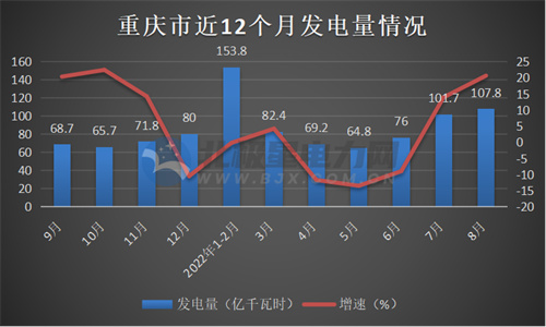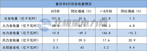 8月份,總發(fā)電量107.8億千瓦時,同比增長20.6%;其中,火電發(fā)電量88.8億千瓦時,同比增長55.1%;水力發(fā)電量14.8億千瓦時,同比減少49.2%;風(fēng)力發(fā)電量3.7億千瓦時,同比增長39.5%;太陽能發(fā)電量0.5億千瓦時,同比增長43%。