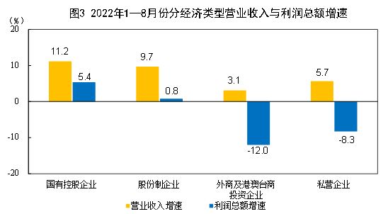1—8月份,規(guī)模以上工業(yè)企業(yè)中,國(guó)有控股企業(yè)實(shí)現(xiàn)利潤(rùn)總額19011.0億元,同比增長(zhǎng)5.4%;股份制企業(yè)實(shí)現(xiàn)利潤(rùn)總額40623.6億元,增長(zhǎng)0.8%;外商及港澳臺(tái)商投資企業(yè)實(shí)現(xiàn)利潤(rùn)總額12797.0億元,下降12.0%;私營(yíng)企業(yè)實(shí)現(xiàn)利潤(rùn)總額14955.5億元,下降8.3%。
