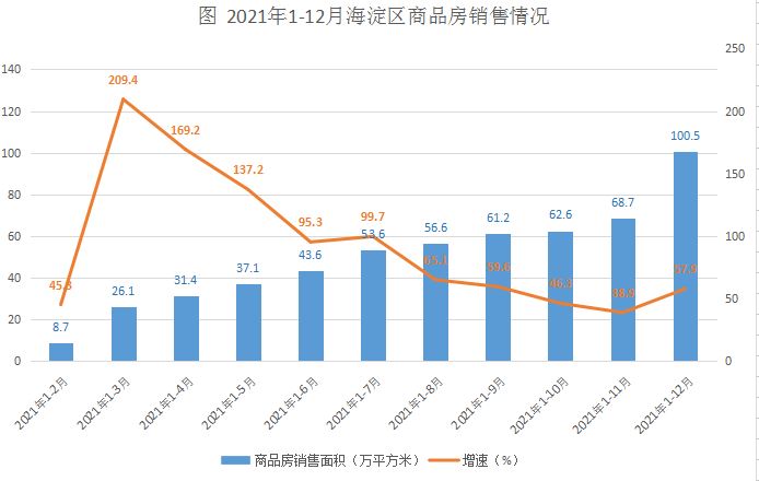2021年1-12月,海淀區(qū)商品房銷售面積100.5萬平方米,同比增長57.9%。