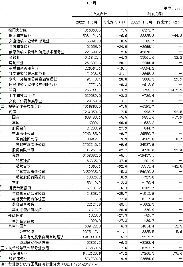 利潤(rùn)總額:指企業(yè)在一定會(huì)計(jì)期間的經(jīng)營(yíng)成果,是生產(chǎn)經(jīng)營(yíng)過程中各種收入扣除各種耗費(fèi)后的盈余,反映企業(yè)在報(bào)告期內(nèi)實(shí)現(xiàn)的盈虧總額。事業(yè)單位、民間非營(yíng)利組織沒有利潤(rùn)總額。(北京市)房山區(qū)2022年上半年規(guī)模以上第三產(chǎn)業(yè)法人單位主要經(jīng)濟(jì)指標(biāo)