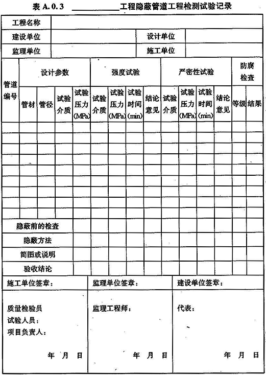 A. 0. 4 管道系統(tǒng)壓力試驗(yàn)應(yīng)由監(jiān)理單位組織施工單位、建設(shè)單位進(jìn)行驗(yàn)收,施工單位應(yīng)按表A. 0. 4的格式填寫驗(yàn)收記錄,并由監(jiān)理單位填寫驗(yàn)收結(jié)論意見。