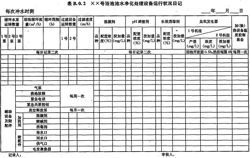 B.0.2 浴池池水凈化處理設(shè)備每日運(yùn)行狀況記錄的內(nèi)容及格式應(yīng)符合表B.0. 2的規(guī)定。