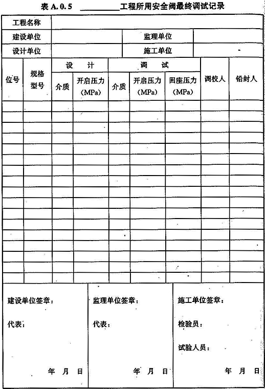 A. 0.5 安全閥最終調(diào)試應(yīng)由監(jiān)理單位組織施工單位、建設(shè)單位進(jìn)行調(diào)試,并應(yīng)由施工單位按表A. 0.5的規(guī)定填寫調(diào)試記錄。