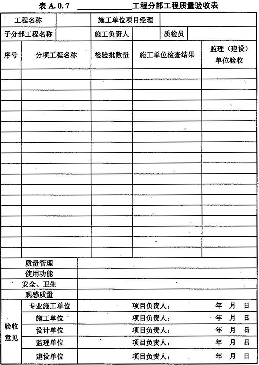 A. 0.7 分項(xiàng)工程質(zhì)量驗(yàn)收應(yīng)由監(jiān)理工程師組織施工單位負(fù)責(zé)人、設(shè)計(jì)單位負(fù)責(zé)人、建設(shè)單位負(fù)責(zé)人進(jìn)行驗(yàn)收,并按表A. 0.7的規(guī)定填寫記錄。