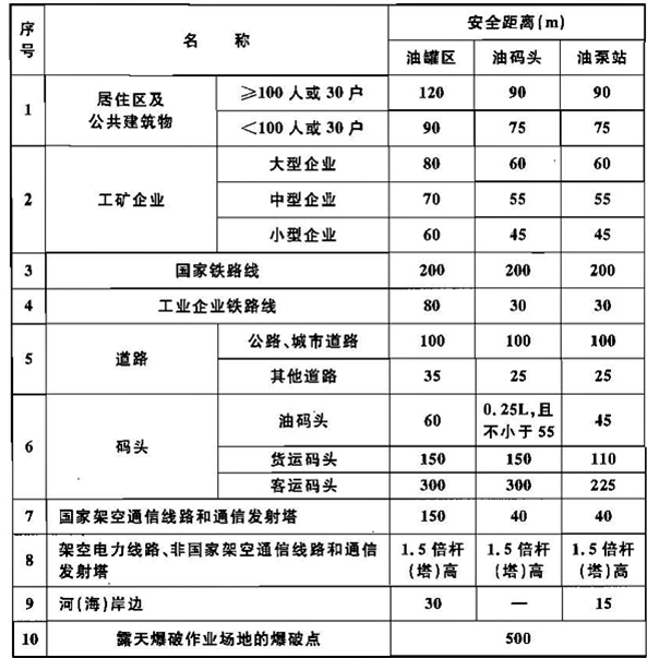 注:1 油罐區(qū)從防火堤頂角線算起;油泵房從泵房外墻軸線算起,露天油泵和油泵棚從泵體外緣算起;碼頭從所??吭O計船型的外緣算起,L為相鄰油船中較大油船的總長度;序號10的安全距離從儲備庫圍墻算起。