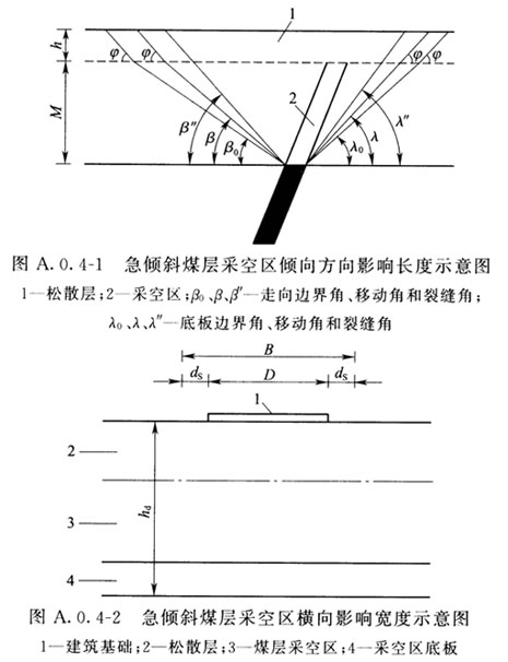 A.0.4 急傾斜煤層采空區(qū)治理范圍與煤層的走向垂直方向,采空區(qū)在傾向上治理區(qū)為危險移動邊界范圍(圖A.0.4-1),其沿煤層傾向治理長度L可按式(A.0.4-1)計算;橫向治理寬度B(圖A.0.4-2)計算可按式(A.0.4-2)計算。