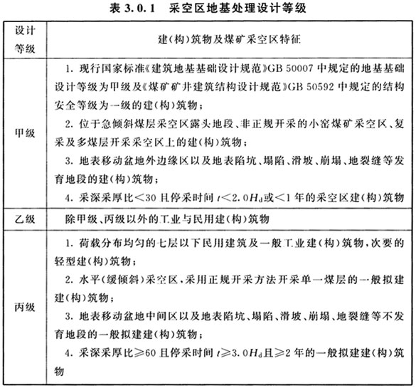 3.0.1 采空區(qū)地面建(構(gòu))筑物地基處理設(shè)計應(yīng)根據(jù)建(構(gòu))筑物規(guī)模、功能特征,采空區(qū)特征以及采空區(qū)地基可能造成建(構(gòu))筑物破壞或影響正常使用的程度分為三個等級,設(shè)計時應(yīng)根據(jù)具體情況,按表3.0.1的規(guī)定確定。
