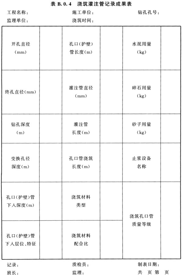B.0.4 澆筑灌注管記錄成果表應(yīng)符合表B.0.4的規(guī)定。