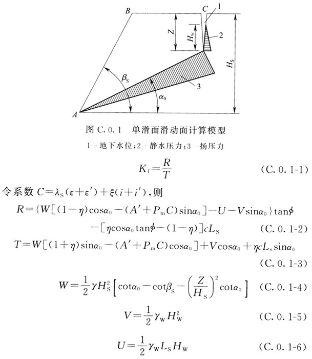 C.0.3 采動邊坡單一平面或圓弧形滑移穩(wěn)定性系數(shù)Kf可按下列公式計算(圖C.0.3)。