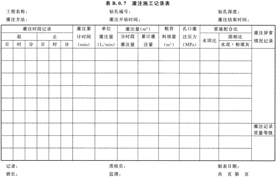 B.0.7 灌注施工記錄表應(yīng)符合表B.0.7的規(guī)定。