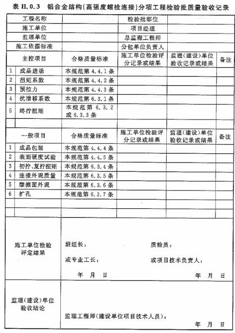 H.0.3 鋁合金結(jié)構(gòu)(高強度螺栓連接)分項工程檢驗批質(zhì)量驗收應(yīng)按表H.0.3進行記錄。