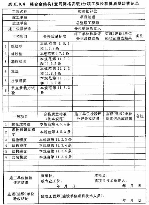 H.0.8 鋁合金結(jié)構(gòu)(空間網(wǎng)格安裝)分項工程檢驗批質(zhì)量驗收應(yīng)按表H.0.8進行記錄。