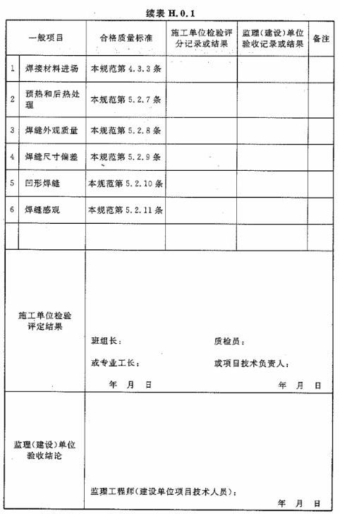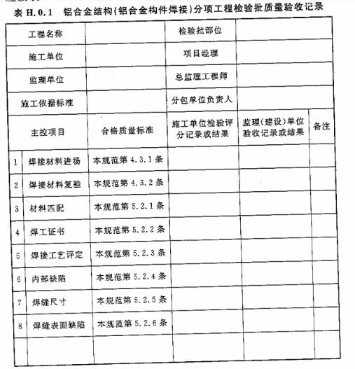 H.0.1 鋁合金結(jié)構(gòu)(鋁合金構(gòu)件焊接)分項工程檢驗批質(zhì)量驗收應(yīng)按表H.0.1進行記錄。