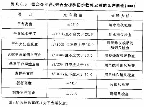 E.0.3 鋁合金平臺、鋁合金梯防護欄桿安裝的允許偏差應(yīng)符合表E.0.3的規(guī)定。