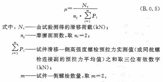 4 抗滑移系數(shù),應(yīng)根據(jù)試驗所測得的滑移荷載和螺栓預拉力的實測值,按式(B.0.5)計算,宜取小數(shù)點二位有效數(shù)字: