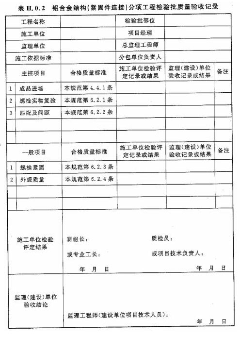 H.0.2 鋁合金結(jié)構(gòu)(緊固件連接)分項工程檢驗批質(zhì)量驗收應(yīng)按表H.0.2進行記錄。