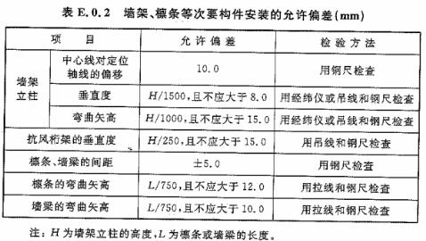 E.0.2 墻架、檁條等次要構(gòu)件安裝的偏差應(yīng)符合表E.0.2的規(guī)定。