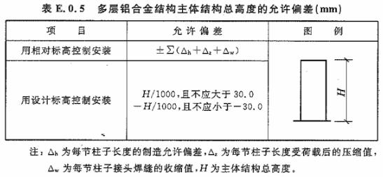 E.0.5 多層鋁合金結(jié)構(gòu)主體結(jié)構(gòu)總高度的允許偏差應(yīng)符合表 E.0.5 的規(guī)定。