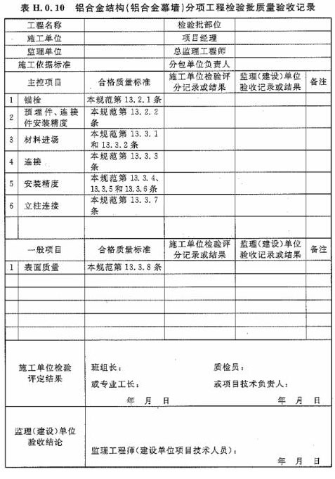 H.0.10 鋁合金結(jié)構(gòu)(鋁合金幕墻)分項工程檢驗批質(zhì)量驗收應(yīng)按表H.0.10進行記錄。