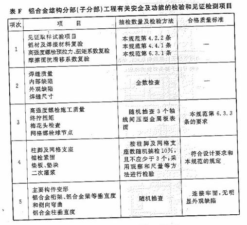 15.0.2 鋁合金結(jié)構(gòu)分部(子分部)工程有關(guān)安全及功能的檢驗和見證檢測項目 應(yīng)符合本規(guī)范附錄F的規(guī)定,檢驗應(yīng)在其分項工程驗收合格后進行。