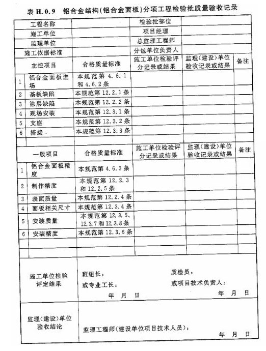 H.0.9 鋁合金結(jié)構(gòu)(鋁合金面板)分項工程檢驗批質(zhì)量驗收應(yīng)按表H.0.9進行記錄。
