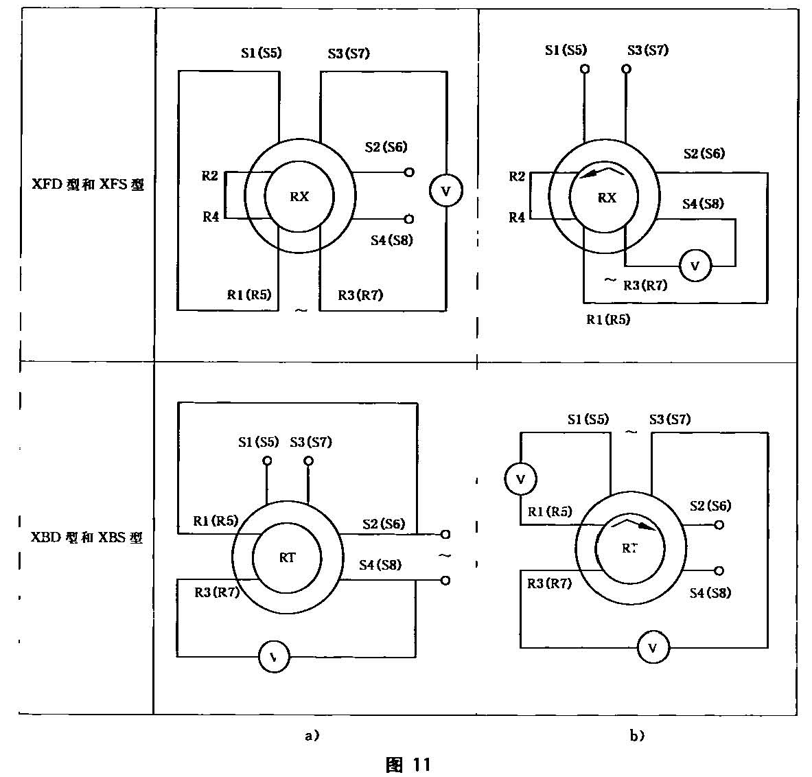 電機安裝在角分度裝置上,按圖1la)接線,額定勵磁,先檢查粗機接線正確性,轉動轉子使相敏電壓表讀數最小,對于XFD型和XFS型電機,確認R1、R3;S1、S3;對于XBD型和XBS型電機,確認S2、S4;R1、R3;再按圖11b)接線,額定勵磁,對于XFD型和XFS型電機,當轉子正向旋轉電氣角度90°時,電壓表讀數由大逐漸減小,則接線正確。對于XBD型和XBS型電機當轉子反向旋轉電氣角度90°時,電壓表讀數由大逐漸減小,則接線正確.大牛工程師