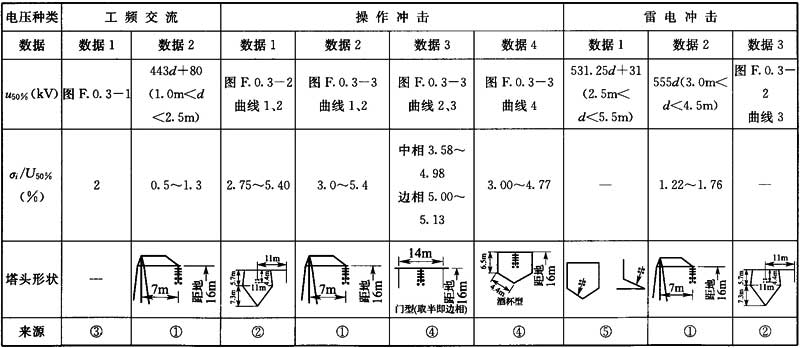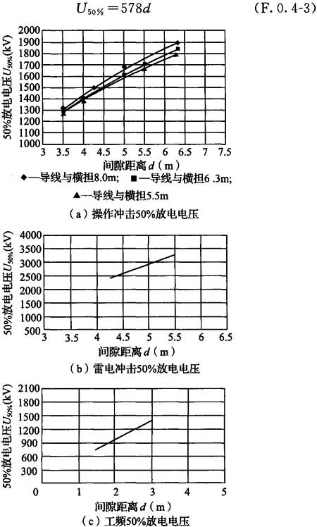 F.0.3 500kV線路桿塔上絕緣子串、線路和變電站空氣間隙的放電電壓: