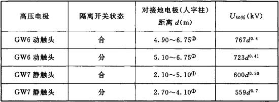 2)隔離開關(guān)對構(gòu)架空氣間隙的操作沖擊50%放電電壓可按表F.0.3-4確定。隔離開關(guān)對車輛空氣間隙的操作沖擊50%放電電壓可按表F.0.3-5確定。