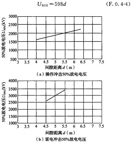 4 750kV同雙回線路空氣間隙的工頻50%放電電壓可按圖F.0.4-4確定,操作沖擊50%放電電壓可按圖F.0.4-5確定,雷電沖擊50%放電電壓可按圖F.0.4-6確定。