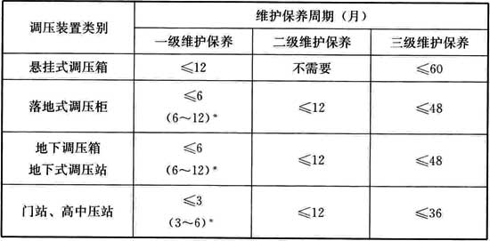 B.0.1 調(diào)壓裝置的維護保養(yǎng)宜分為三級,各級維護保養(yǎng)的周期宜符合表B.0.1的規(guī)定,對維護保養(yǎng)中發(fā)現(xiàn)的問題應(yīng)進行現(xiàn)場處理。