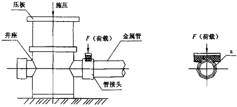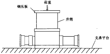 將井體井筒組合試件按圖10設(shè)置于測試平臺(tái),井筒上方壓板上施壓穩(wěn)定試件,在管接頭上,以10mm/min±2mm/min速率施加表7規(guī)定的荷重F,目測井座接頭有無產(chǎn)生裂縫和開裂。
