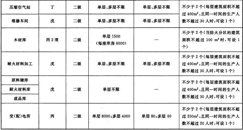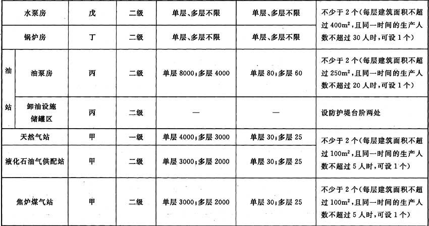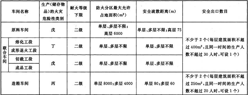 表E 光伏壓延玻璃工廠的火災(zāi)危險(xiǎn)性類(lèi)別、耐火等級(jí)、防火分區(qū)最大允許建筑面積、安全疏散距離及安全出口數(shù)目