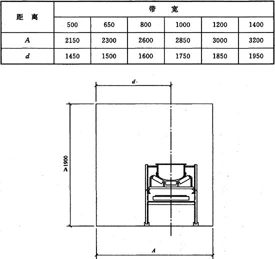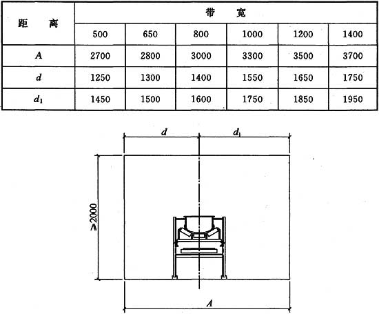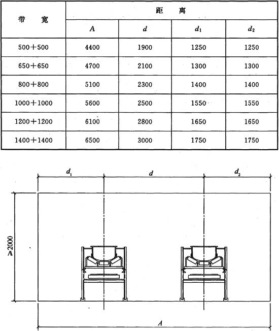 A-通廊總凈空;d-兩條膠帶輸送機(jī)中心距;d1,d2-兩條膠帶輸送機(jī)中心至走廊外緣距離